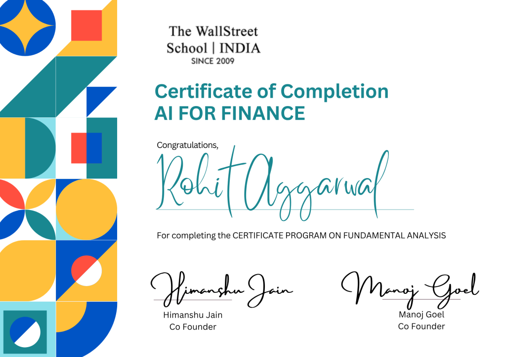 Once candidates complete the AI for Finance program, they receive a certification from The Wall Street School. This certification is well-recognized in the finance industry and signals strong proficiency in applying AI tools to real-world finance workflows. A bonus badge is also awarded upon successful submission of the capstone project. Sample certificate is attached for reference.