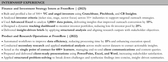 Finance roles live on metrics: revenue, cost reduction, risk exposure, turnaround time and accuracy improvement. Even internships should show measurable outcomes.