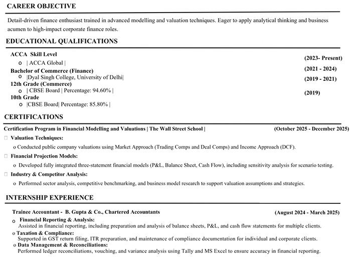 A clean black and white PDF with clear headings always wins. Uniform font size, aligned bullet points and enough white space make your resume readable in seconds. This is one of the most ignored finance resume mistakes especially among freshers.