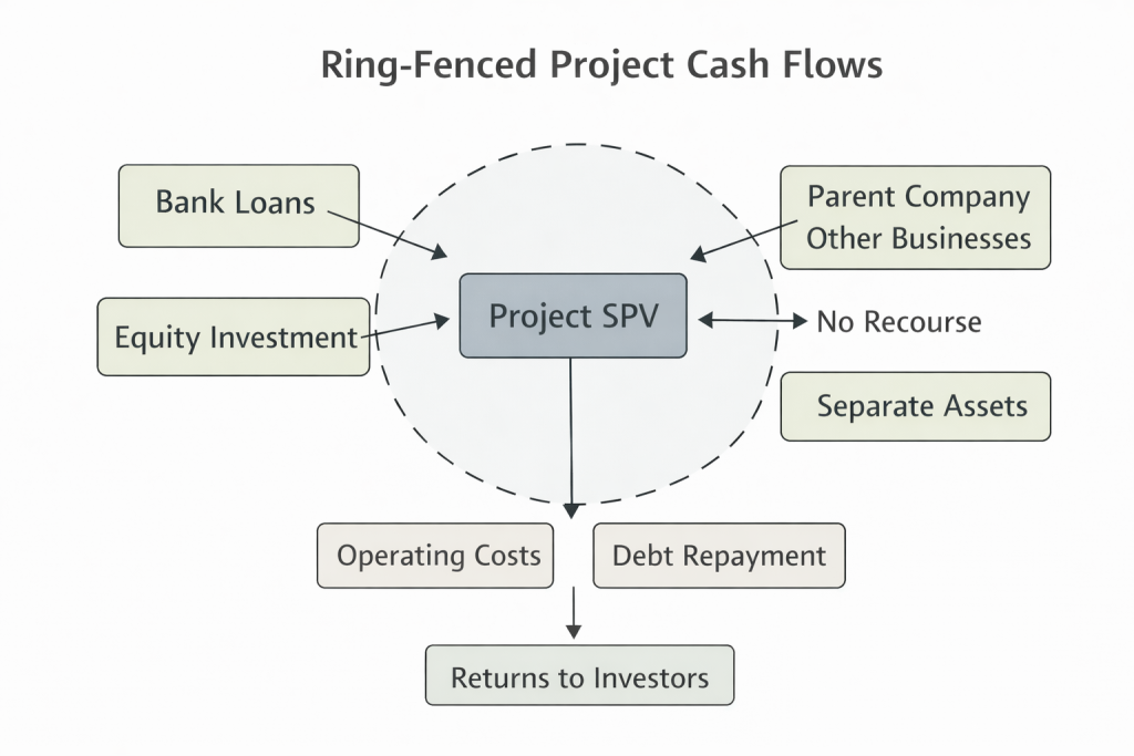 Figure 2: Ring-fenced structure in project finance modelling illustrating how project cash flows are separated from the sponsor’s other businesses.