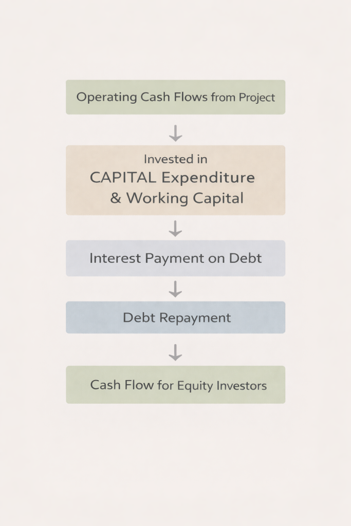 Figure 3: Cash flow allocation in project finance showing how operating cash flows are invested, debt is serviced and residual cash flows go to equity investors.