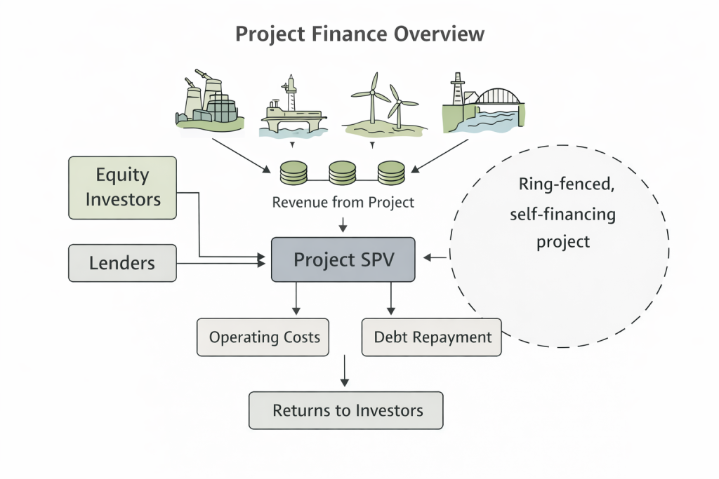 Figure 1: Project finance modelling overview showing how a single project generates cash flows, repays debt and delivers returns through a ring-fenced structure.