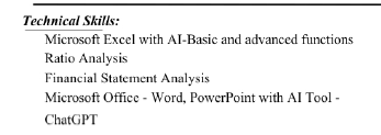 Add AI tools under your finance resume technical skills list if you used them for financial modelling, forecasting, data analysis, report automation or anomaly detection.