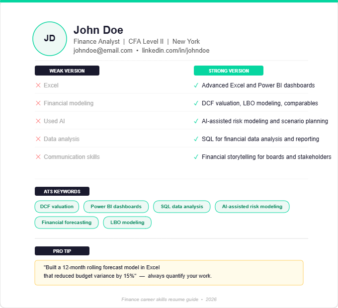 Use ATS-friendly terms like “DCF valuation,” “Power BI dashboards,” “SQL for data analysis,” and “AI-assisted risk modeling.” Quantify your work wherever you can. Instead of writing “built financial models,” say “built a 12-month rolling forecast model in Excel that reduced budget variance by 15%.” This level of detail makes your finance analyst skills stand out clearly.