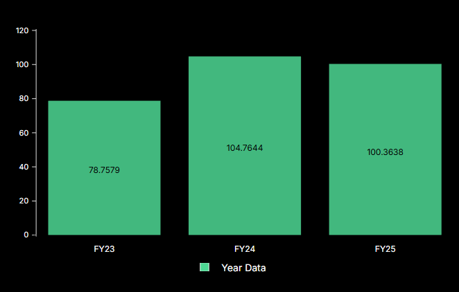 The chart shows that the company’s revenue increased from around ₹78.75 crore in FY23 to approximately ₹100.36 crore in FY25. This indicates steady business growth and increasing project execution over the last three years.