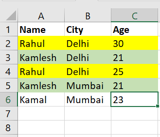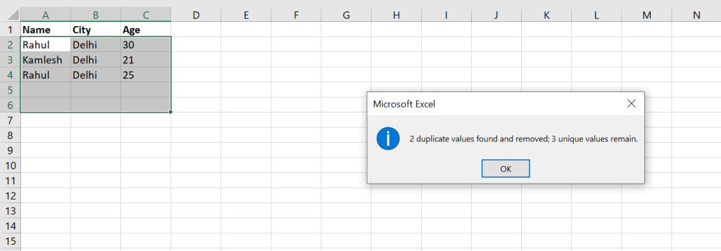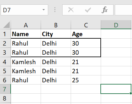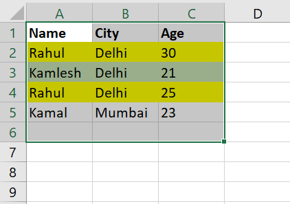Consider the example below, where Row 2 and 3 are exactly identical i.e. Name, City and Age, all are similar in these two Rows.