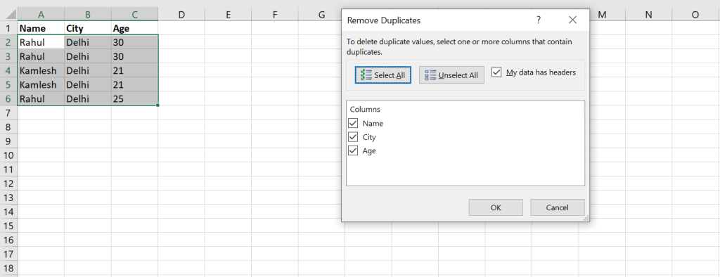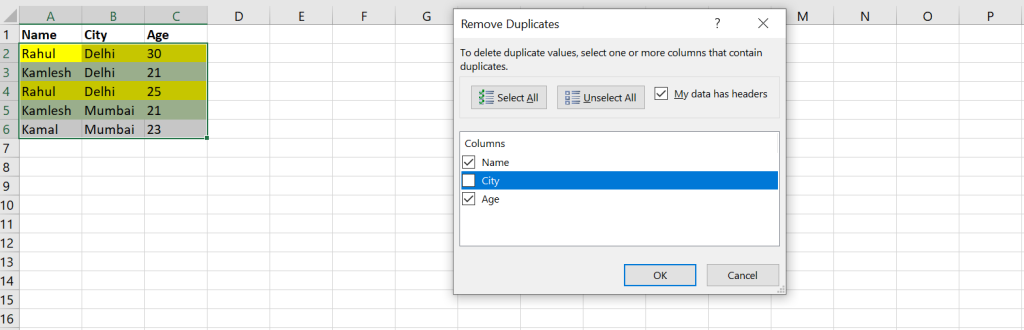 If you wish to remove the rows which are completely duplicate i.e. they have the same entries under all columns (Name, City, Age) then you can simply press ALT + A + M and tick mark all the columns of the dialogue box that appears, as shown below
