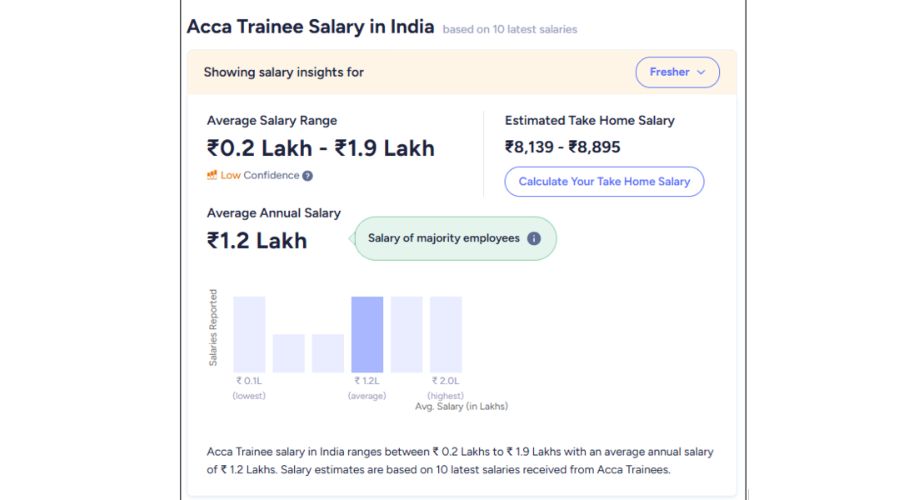 - Salary Potential: ACCA trainees earn between INR 0.2 lakhs and INR 1.9 lakhs in India. Salaries can be lower or higher in other countries.
